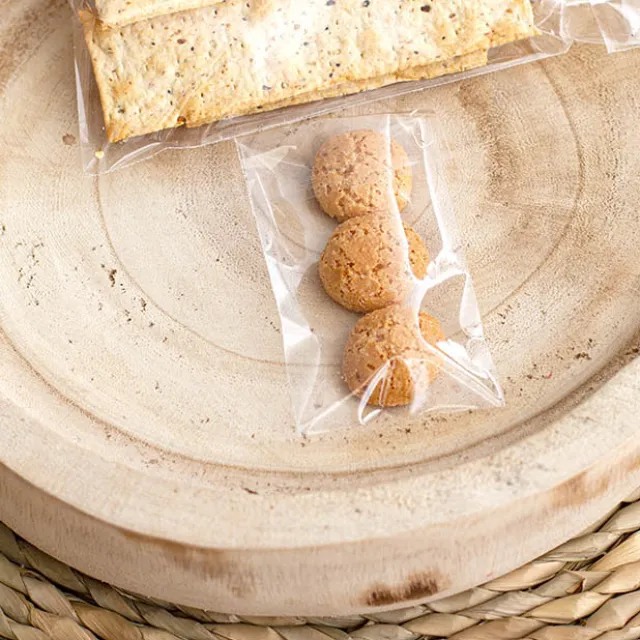 They are made from BOPP (Biaxially Oriented Polypropylene), a high-clarity, durable plastic that is widely used in food packaging due to its moisture-resistant and non-toxic properties.