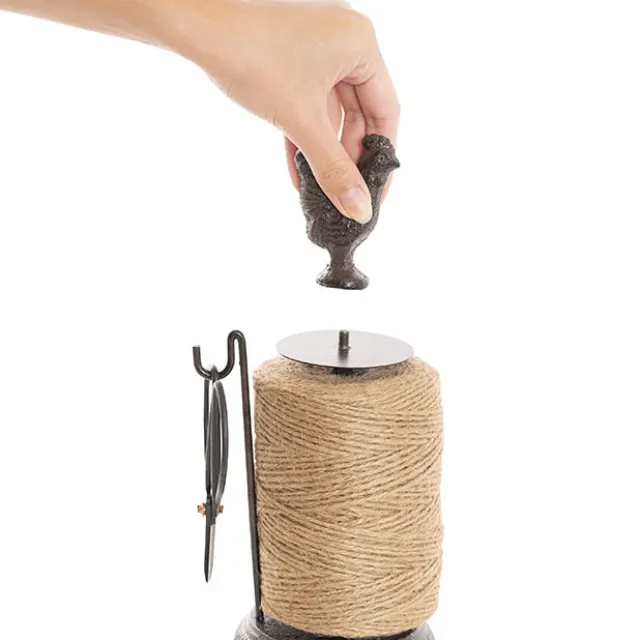 This rustic metal holder holds a full tall roll of jute (included) and can be put on display so you have easy access to string.