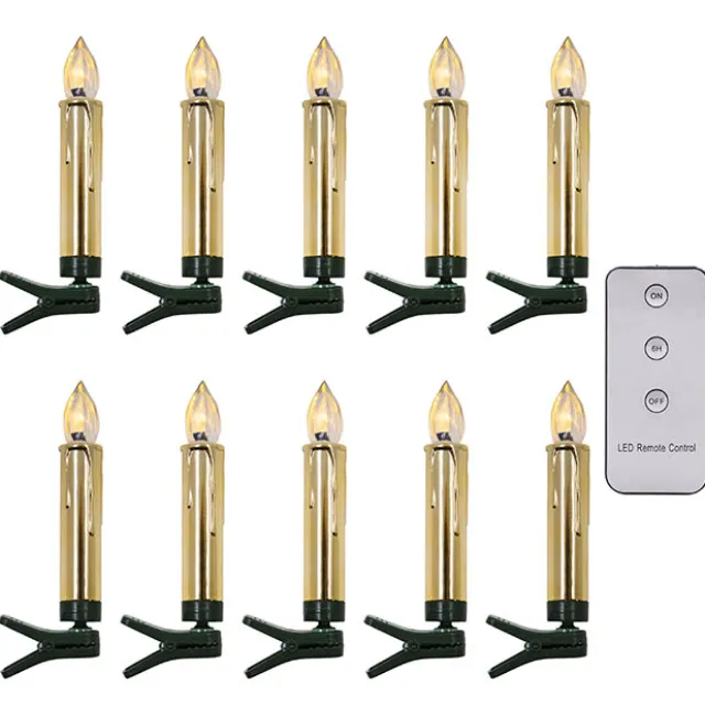 Each candle is powered by 1 x AAA battery, which is not included. Each candle measures 9cm tall and 1.5cm in diameter. The 3key remote functions with ON/OFF/TIMER, powered by 1 x CR2025 button cell, which is included. These LED candles are available in a pack of 10.