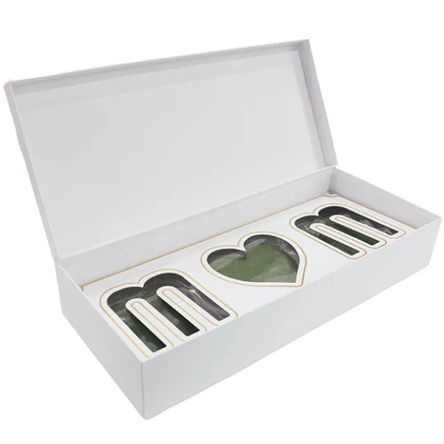 It features a white base, a white and gold cut-out insert, a white lid, and a clear tray with foam. The base holds a plastic tray with floral foam, topped with a cardboard insert featuring the white “M heart M” cut-out with gold decorative trim. The insert is adorned with a gold border for an extra touch of elegance.