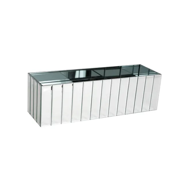 This vase has internal measurements of 11.5cm deep, 39.5cm wide, and 12cm tall. External measurements are 12.5cm deep, 12cm tall, and 40.5cm wide. The interior of this vase is also covered in a glass mirror reflective surface.
