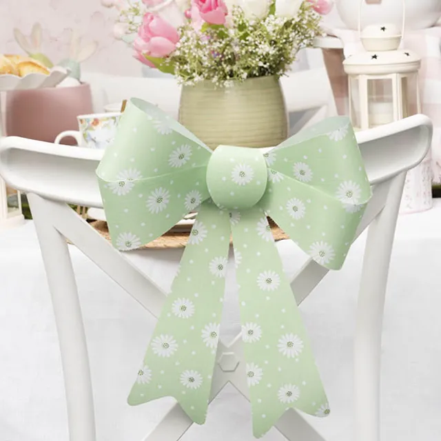 The overall width of this bow is 28cm. The overall length, from the top loop to the tail end, is 37cm. The bow loop measures 8.2cm wide at its widest point. This bow is sold individually.