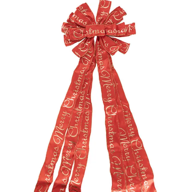 This tree topper bow features a red satin ribbon with gold Merry Christmas print and is 60mm wide and has 16 loops at the top.