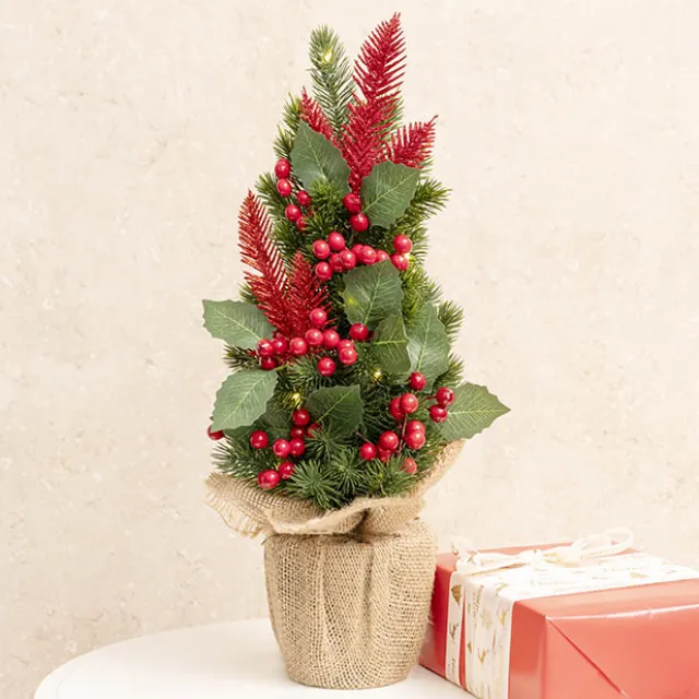 This tree is finished with a rustic hessian pot cover. It requires 2 x AA batteries, which are not included. This tree measures 46cm tall and is sold individually.