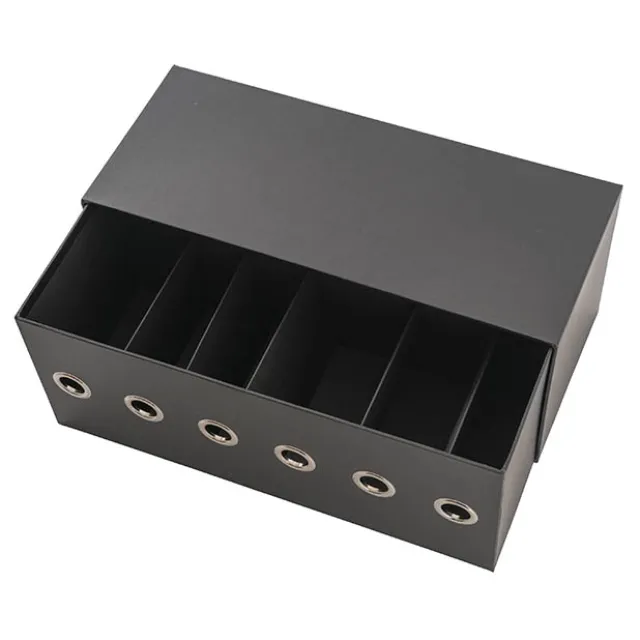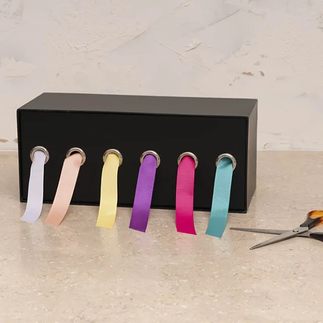 This dispenser box has the added benefit of being easy to carry and also being stackable. The ribbon storage box includes 6 holes where ribbon can be threaded through.