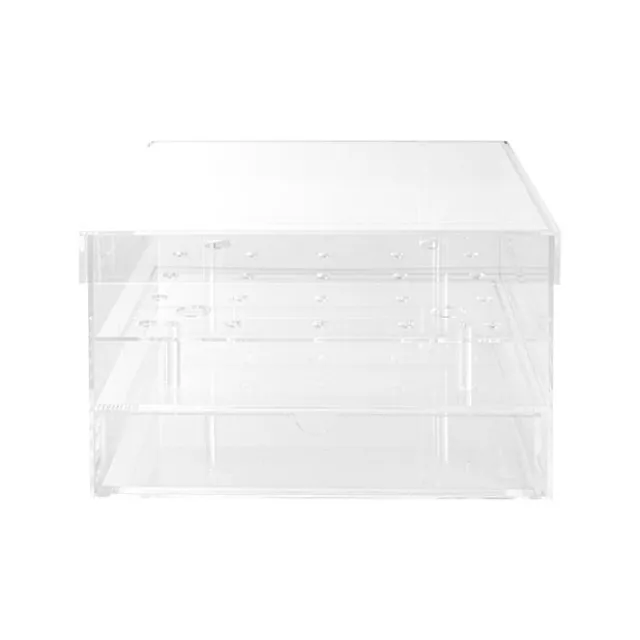 The top flower compartment is kept separate from the bottom drawer by a clear acrylic divider (which is not removable), so that moisture doesn’t affect whatever is stored within the drawer. This makes the drawer safe for delicate things like sweets and chocolates, which will keep better for longer separate from the moisture of flowers. In the shelf insert, stem holes measure 10mm wide. Internal drawer dimensions: 4.3cm tall, 24cm deep, 23.5cm wide. Top compartment internal measurements: 24.5cm wide, 24.5cm deep, and 9.7cm tall. Overall, acrylic is 3mm thick. Comes with rubber pads on the base for stability and to prevent scratching. Sold individually.