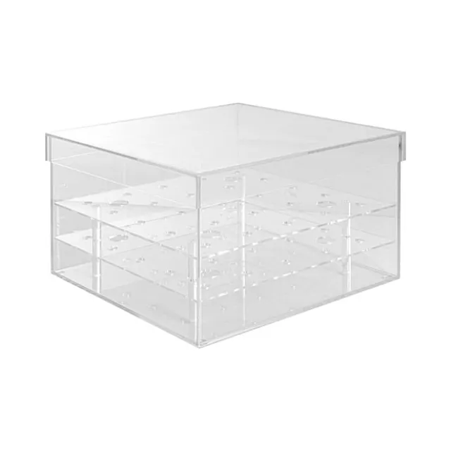 Overall, acrylic is 3mm thick. Box measures 25x25x15cmH without lid. Lid measures 25.7×25.7×2.9Hcm. Overall height with lid on measures 15.4cm. In the shelf insert, stem holes measure 10mm wide. Internal dimensions of acrylic box without insert: 15cm tall, 24.5cm wide, and 24.5cm deep. Overall, acrylic is 3mm thick. Comes with rubber pads on the base for stability and to prevent scratching. Sold individually.