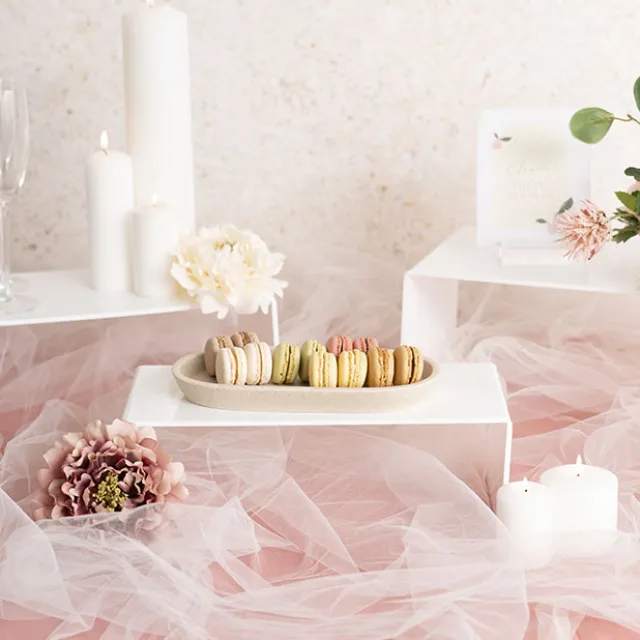 The smallest riser measures 34.7cm wide. 16cm deep, 11.7cm deep. The medium riser measures 39.5cm wide, 18cm deep, and 14.7cm tall. The largest riser measures 45cm wide, 20cm deep, and 17.6cm tall.