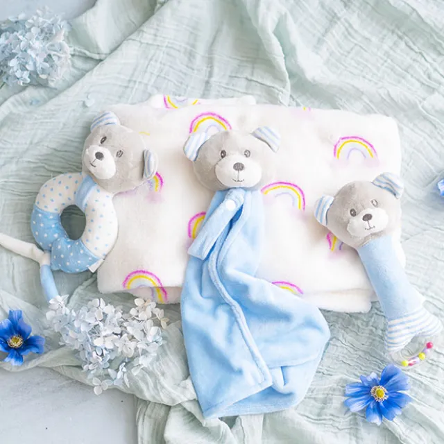 – Ultra-soft polyester fleece blanket with a rainbow design. Measuring 100cm x 70cm