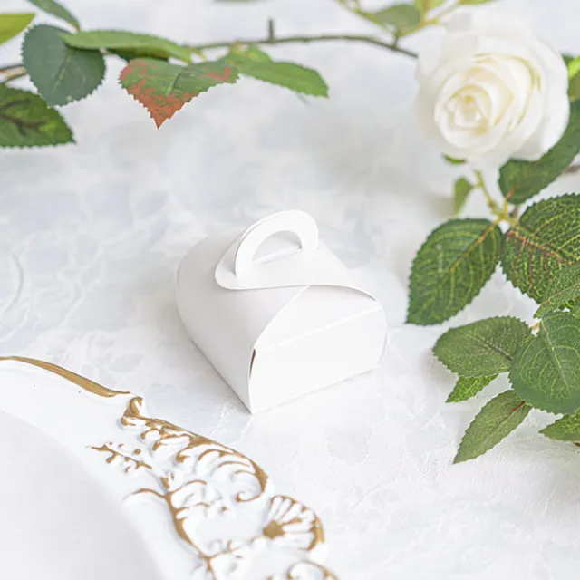 They are available in a pack of 20 and each comes flat-packed in one piece. You just fold together and tuck in. All fold lines are scored for easy assembly. 250gsm. Recyclable. This box will comfortably hold 6-8 sugared almonds.