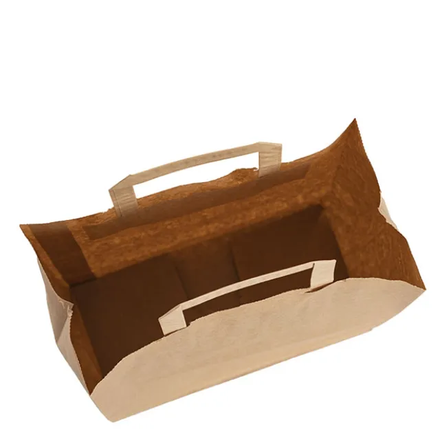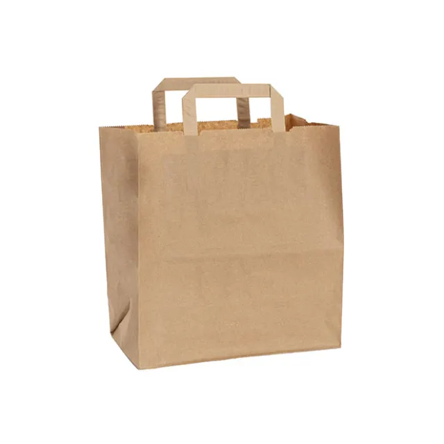 Large Brown Kraft Paper Bag features flat paper sturdy handle. Made from 70gsm kraft paper which has high elasticity and high tear resistance, designed for packaging products with high demands for strength and durability. Sits up on counter for easy packing. Can hold up to 10kg. Available in a pack of 10.