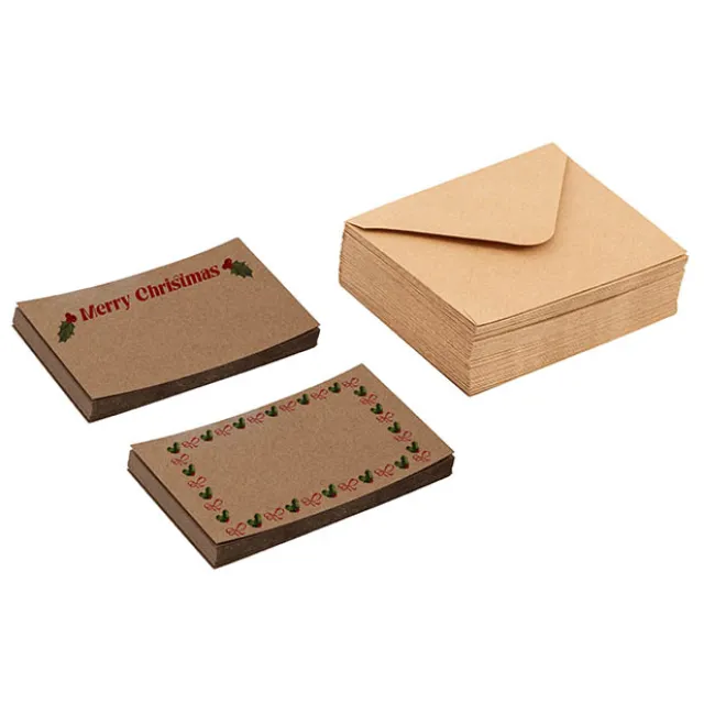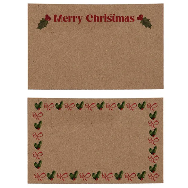 This card pack features two different designs, printed onto kraft brown cardstock. One style includes a Merry Christmas sentiment with Holly at the top, leaving enough room for a personal message underneath. The second design is a Holly border print with a blank centre for your message.