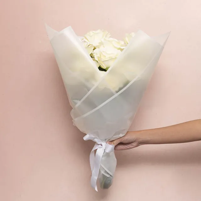 It will wrap them in a White frosted hue cello with a darker tone white silhouette border and frame your flowers perfectly.