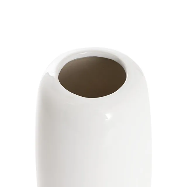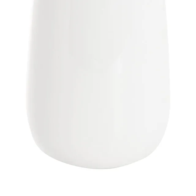 This white vase has a glossy finish and measures 14cm in diameter at the base, 6cm in diameter at the lip, and 22cm in height.