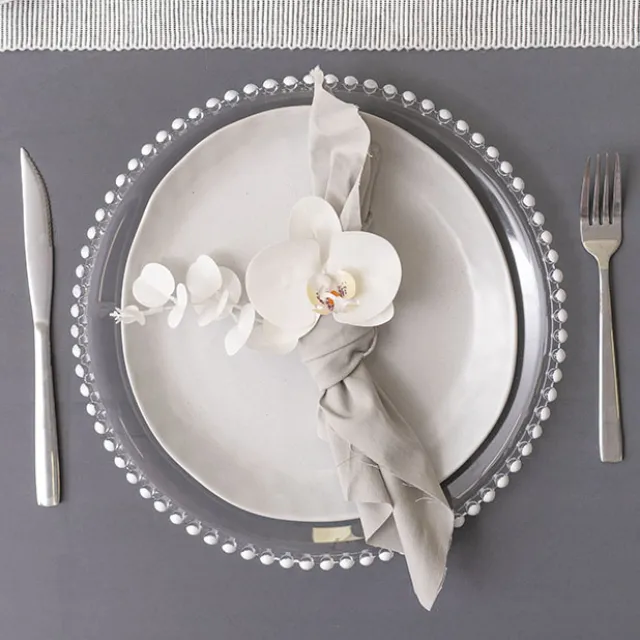 Elevate your dining setting with this simple yet elegant set of clear charger plates with a rustic painted white beaded edge. Each shallow plastic plate can be placed under your service plates to create a stunning tablescape. They can also be used for a candle display or as an elegant table centrepiece.