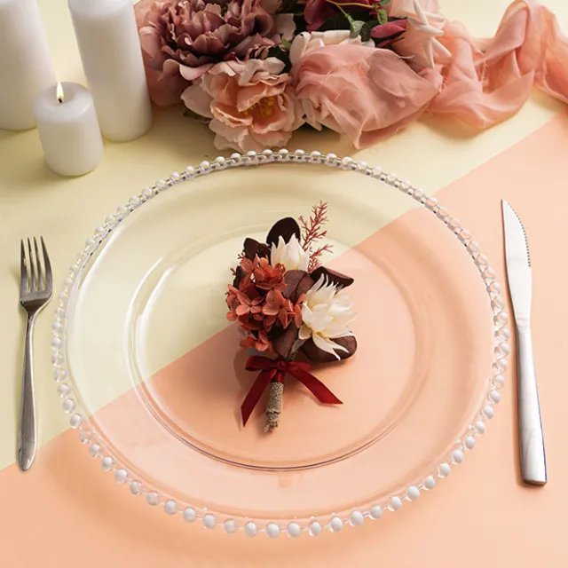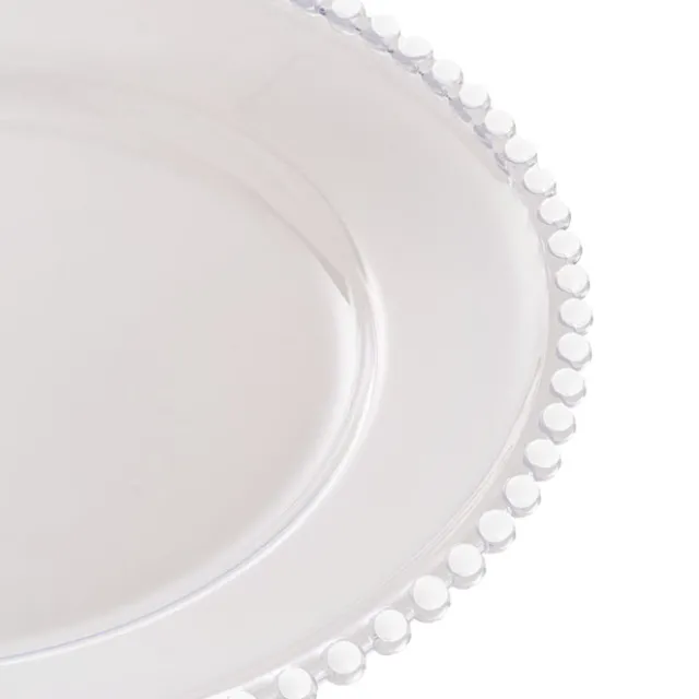 Elevate your dining setting with this simple yet elegant set of clear charger plates with a rustic painted white beaded edge. Each shallow plastic plate can be placed under your service plates to create a stunning tablescape. They can also be used for a candle display or as an elegant table centrepiece.