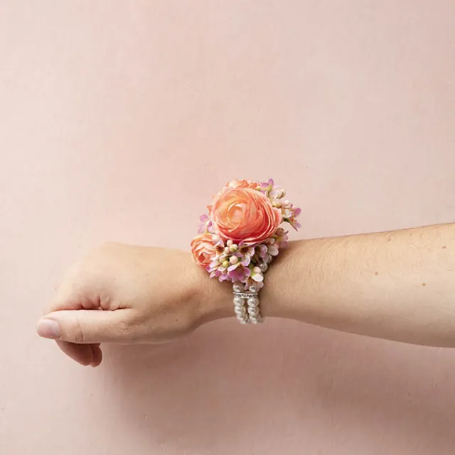 The pearls measure 8mm in diameter. The corsage measures 6cm in diameter, stretching up to 10cm. The height of the strands of beads measures 1.6cm. This bracelet is available in a pack of two.