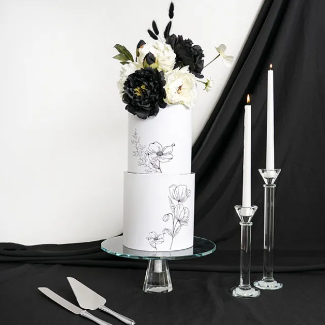 It measures 30cm in diameter and 12.5cm tall. The base measures 8cm at its widest point. This cake stand is also available in a smaller size.