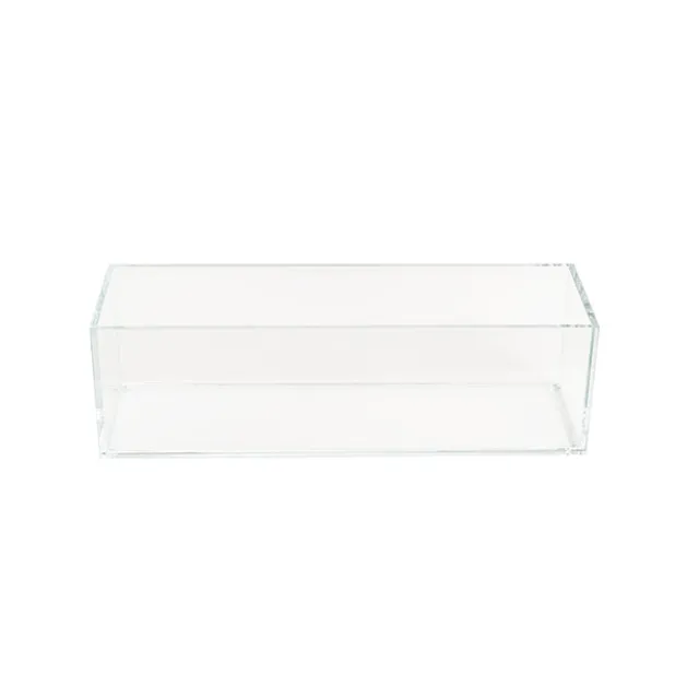This clear vase measures 6mm thick, 40cm wide, 12cm deep, and 12cm high. Internally, this vase measures 11.5cm tall, 39.3cm wide, and 10.8cm deep. Each corner of the base has a clear rubber pad. This vase is also available in a smaller size.