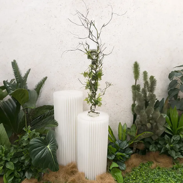 The Elite Foldable pedestal has a unique 90 layer accordion construction with an elegant ripple honeycomb look. Each column is 31cm in diameter and comes in two sizes: 70cm and 90cm tall.Each column has a frosted finish acrylic topper, measuring 31cm in diameter and 3mm thick. The acrylic top provides a smooth, level surface for displays and fortifies the stand to bear a weight of up to 50kg.