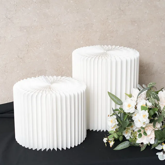 The Elite Foldable pedestal has a unique 90 layer accordion construction with an elegant ripple honeycomb look. With one riser measuring 25cm tall and the other measuring 35cm tall, both risers measure 31cm in diameter.Each riser has a frosted finish acrylic topper, measuring 31cm in diameter and 3mm thick. The acrylic top provides a smooth, level surface for displays and fortifies the stand to bear a weight of up to 60kg.