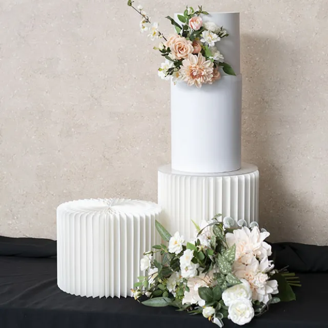 The Elite Foldable pedestal has a unique 90 layer accordion construction with an elegant ripple honeycomb look. With one riser measuring 25cm tall and the other measuring 35cm tall, both risers measure 31cm in diameter.Each riser has a frosted finish acrylic topper, measuring 31cm in diameter and 3mm thick. The acrylic top provides a smooth, level surface for displays and fortifies the stand to bear a weight of up to 60kg.