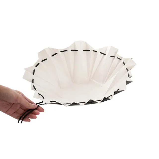 The pod is 13.8cm wide at the base and 14.4cm tall. They are flat-packed and pre-scored/pre-folded. The threaded rope helps you to pull the pod up and into place to surround your arrangement. Giving a lovely fluted designer look.