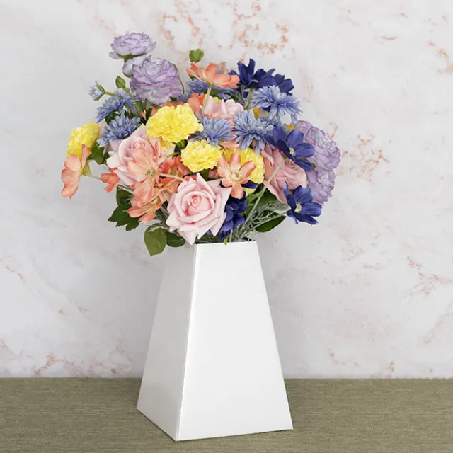 Complete with a flat base, these pods offer a stable packaging solution that aids in transportation of bouquets. They are a disposable alternative to plastic. They also offer easy vase-less display of flowers. Recipients will no longer need to scramble for a vase if they receive an arrangement away from home, at the office or hospital.