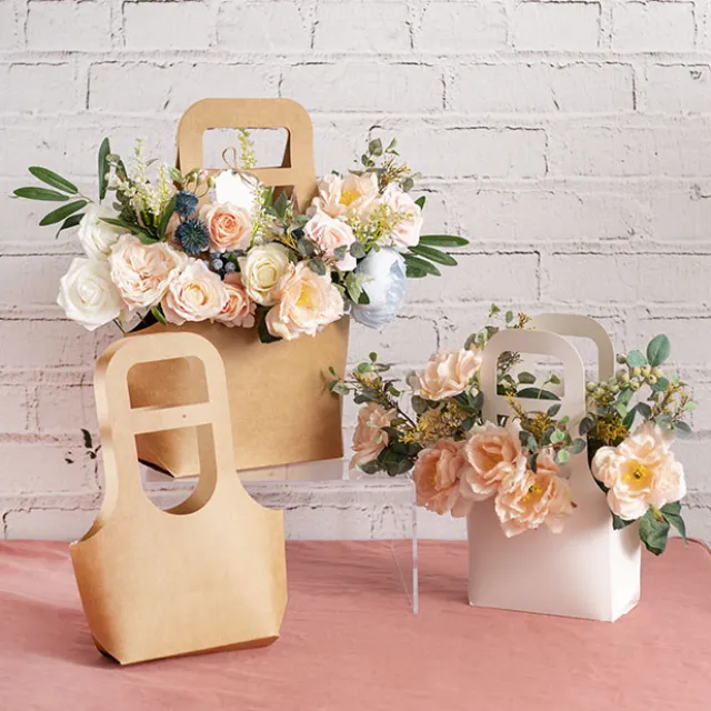 Internal measurements of this bag measure approximately 11cm deep at the top, 9.8cm deep at the base, 29cm wide at the top, 21cm wide at the base, and approximately 18.2cm tall in the middle, and 16.2cm tall at each end. The lower window in the handle for flowers to poke through measures 13.5cm tall and up to 10.5cm wide. This product is available in packs of five, also in white, and in a smaller size