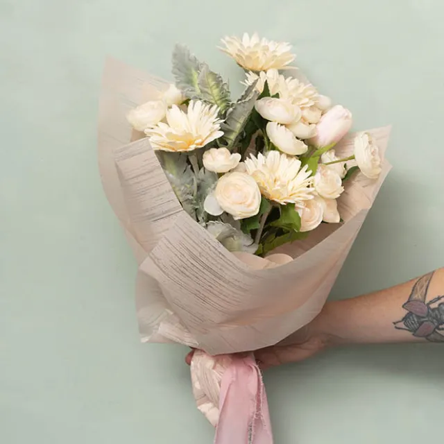 This flower wrap measures 50-micron in thickness and is waterproof. Each sheet size measures 50cm by 70cm. This wrap is available as a pack of 100 sheets.