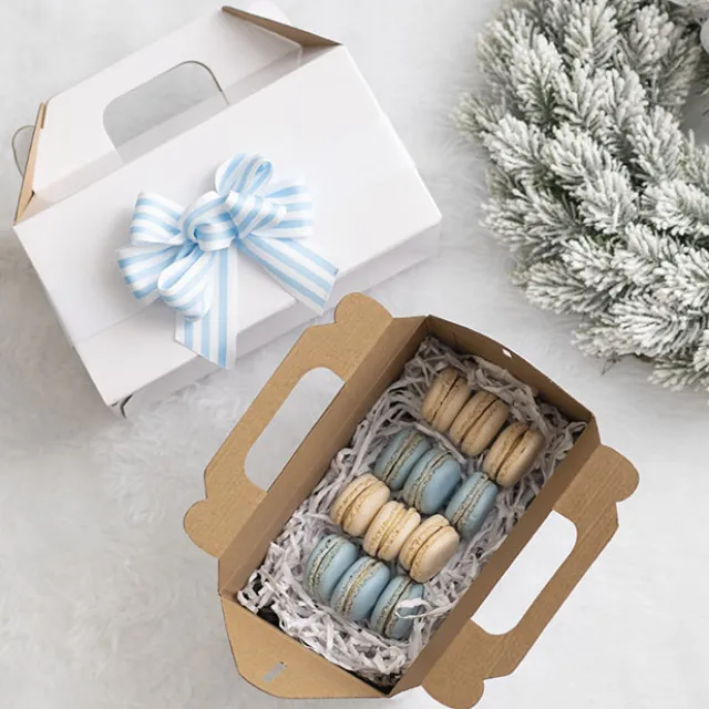 Usage suggestions: Can be used for sweet or savoury fresh food, canned/dry goods or other gifts. When using with patisserie food, please use with Food Grade shred or paper. If using with greasy or oily food, please use wax proof paper and/or aluminium foil along the base. Do not let hot or greasy goods stand inside for extended periods as it is a cardboard box designed for transport and short display.