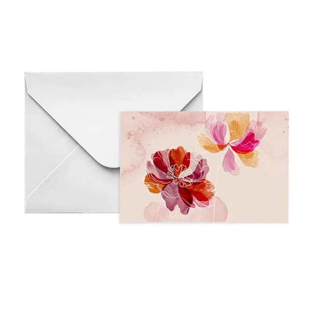 This top folding card features hand-drawn pink and orange flowers with white outlines. Use this card as the perfect finishing touch to any floral arrangement or present, offering a personal space on the inside for you to convey heartfelt messages or well wishes. The elegant fold-over design provides a premium feel and added privacy for your notes.