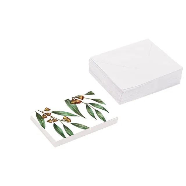 This top folding card has a native print of gumnut leaves and nuts on the front creating a striking gift card.