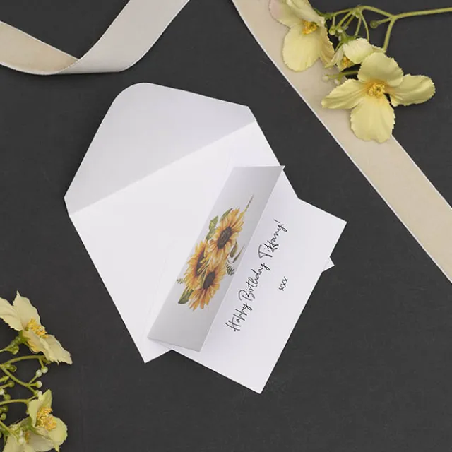 This pack includes 25 folded cards, along with 25 white envelopes. Each card measures 10cm wide, 6.5 cm tall when folded, 13cm when flat.