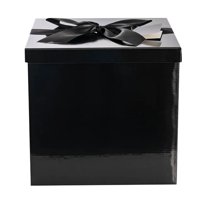 This box is flat packed for convenience and easy to assemble. Made of 300gsm E-flute corrugated materials, this box comes with a pre-attached black ribbon bow and small gift card.
