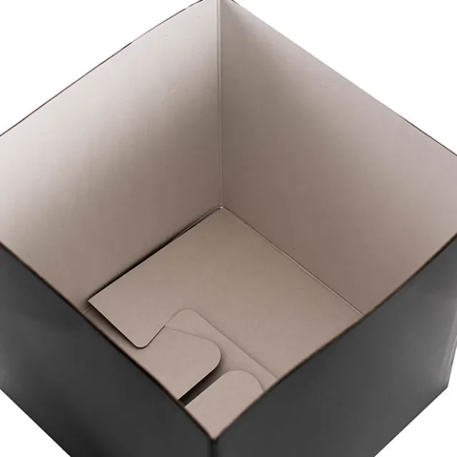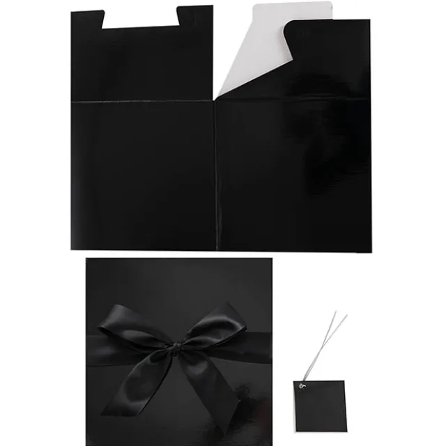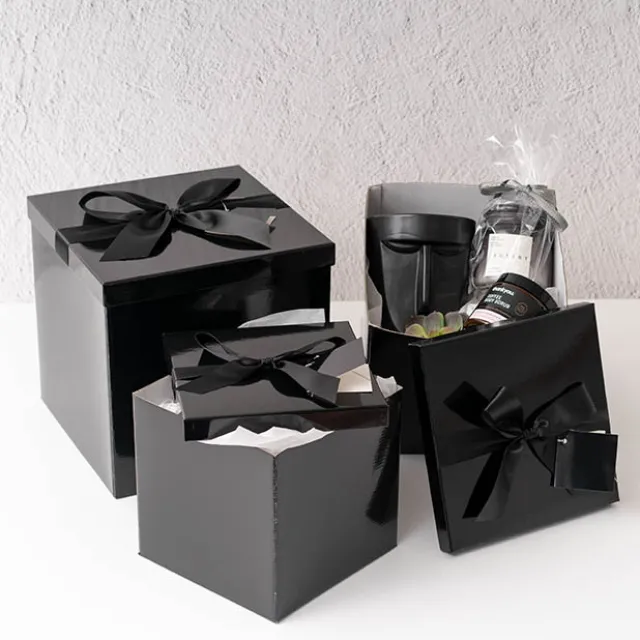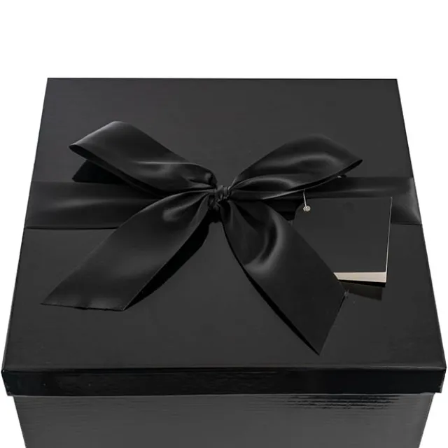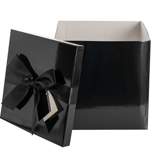 This box is flat packed for convenience and easy to assemble. Made of 300gsm E-flute corrugated materials, this box comes with a pre-attached black ribbon bow and small gift card.