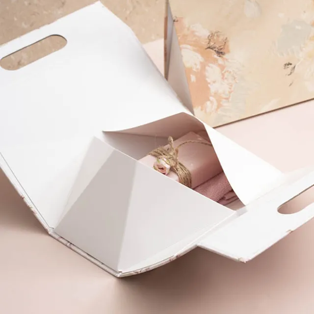 This box is flatpack and simple to put together. To assemble, simply push the sides up, add your gifts inside and push together to secure the magnetic closure. Add a ribbon through the handle to secure.
