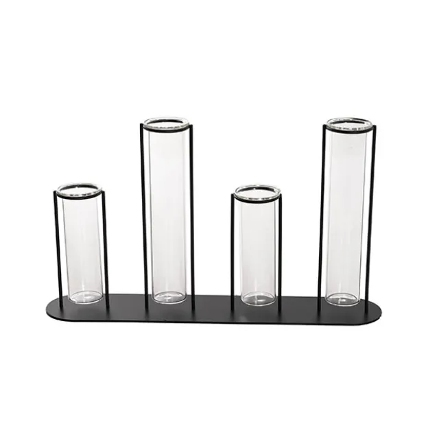 Crafted with precision, the sturdy metal frame provides a stable and elegant structure, while the clear glass tubes create a stunning visual contrast. The open design allows for easy access, making it simple to change water or swap out flowers as needed. Whether placed on a tabletop, shelf, windowsill, or as a low-lying centrepiece on a dinner table, this piece effortlessly blends into contemporary, industrial, or minimalistic interiors.