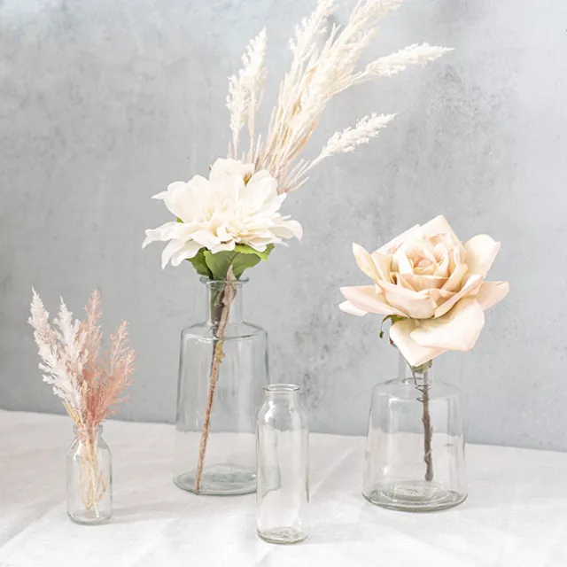This bottle vase has a top opening of 3.6cm, measures 11.5cm in diameter, and stands 17cm tall. This product is compatible with our Large Cork (SKU: 222143).