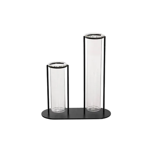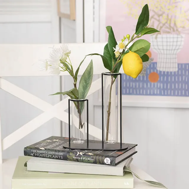 Crafted with precision, the sturdy metal frame provides a stable and elegant structure, while the clear glass tubes create a stunning visual contrast. The open design allows for easy access, making it simple to change water or swap out flowers as needed. Whether placed on a tabletop, shelf, windowsill, or as a low-lying centrepiece on a dinner table, this piece effortlessly blends into contemporary, industrial, or minimalistic interiors.