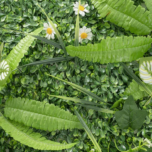 The plastic net backing and tabs make for easy attachment to your surface when creating your greenery backdrop. The mat needs to be securely fixed to your backdrop or wall when used vertically, we recommend using cable ties to do this. Measure 40cm x 60cm.