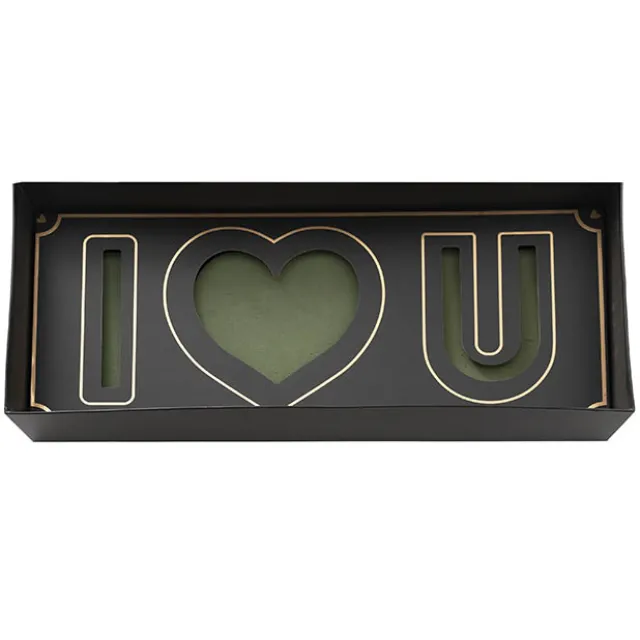 It features a black base, a black and gold cut-out insert, a black lid, and a clear tray with foam. The base includes a plastic tray that holds floral foam, topped with a cardboard insert featuring the “I Heart U” cut-out and gold, decorative trim. The insert is adorned with a gold border for an extra touch of elegance.