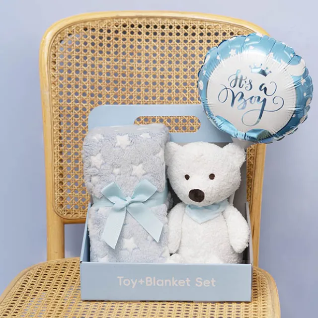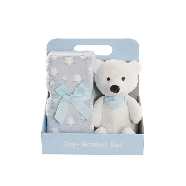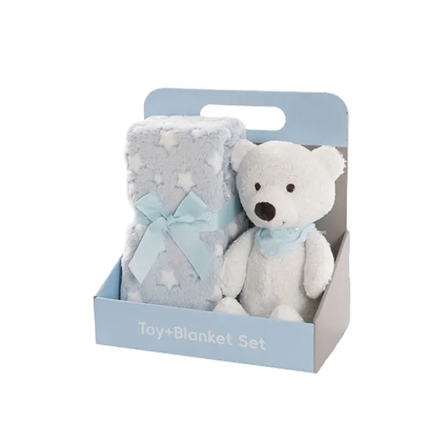 The teddy bear measures 23cm tall when seated. The plush blanket measures 90cm x 75cm. This gift set is sold individually.