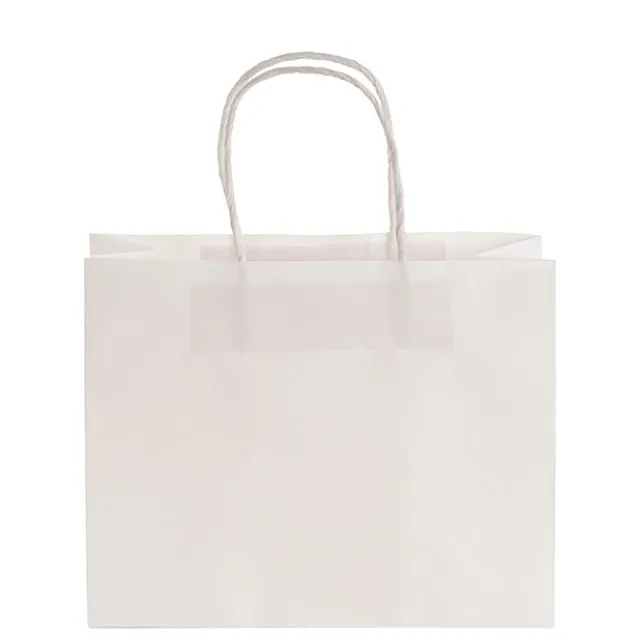 Available in a pack of 10, each bag measures 120gsm thick, can bear up to 14kg, features twist handles, and a flat base for easy packing. Also available in brown and a range of sizes, this bag measures 350mm tall, 450mm wide, and 100mm deep in the gusset