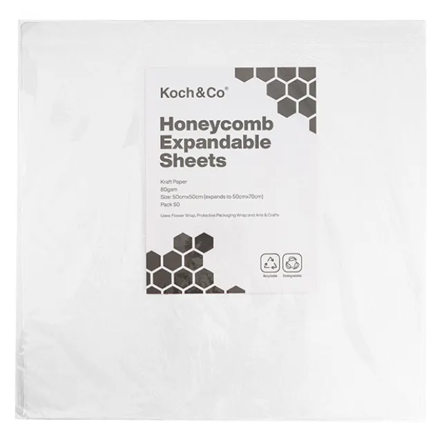 Each sheet measures 50cm x 50cm and expands to 50cm x 60-70cm at maximum extension. Once expanded, this honeycomb wrap measures approximately 4mm thick. Available in a pack of 50 sheets, honeycomb or honey comb wrap is also known as Hex wrap.