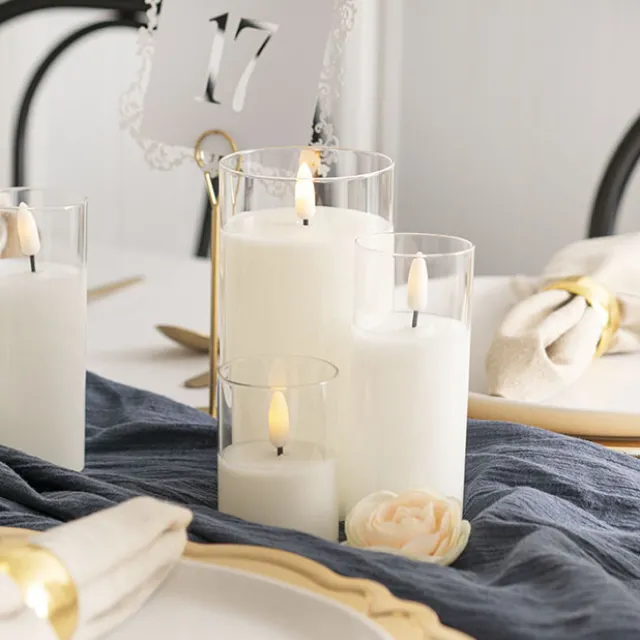Be mesmerised by the magic of LED event candles. This Glass Trueflame™ Flickering LED White pillar candle gives a cosy ambiance like a real candle. It is a safe alternative to decorate your home, weddings and any special events. Featuring a glass holder filled with real wax, long battery lighting life and a realistic flameless glow.