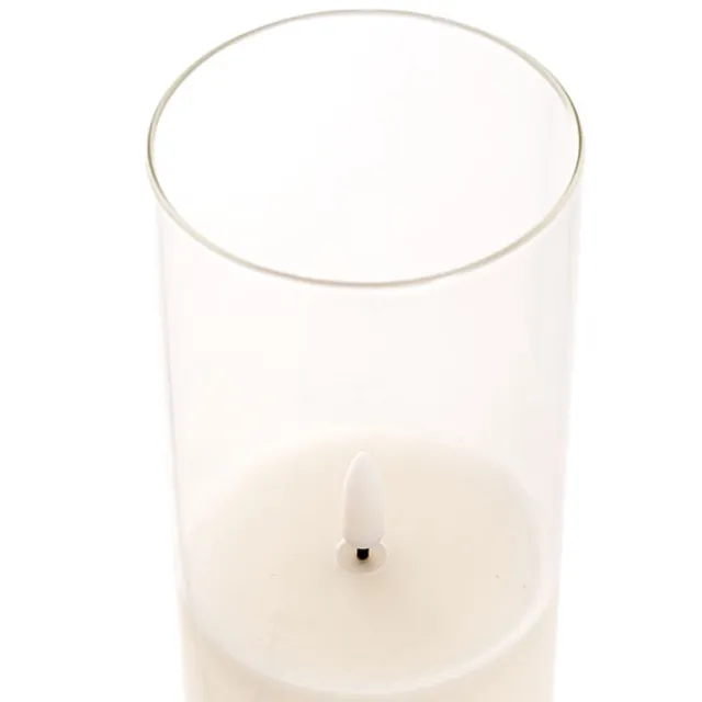Be mesmerised by the magic of LED candles. This Glass Trueflame™ Flickering Led White pillar candle gives a cosy ambiance like a real candle. It is a safe alternative to decorate your home, weddings and any special events. Featuring a glass holder filled with real wax, long battery lighting life and a realistic flameless glow.