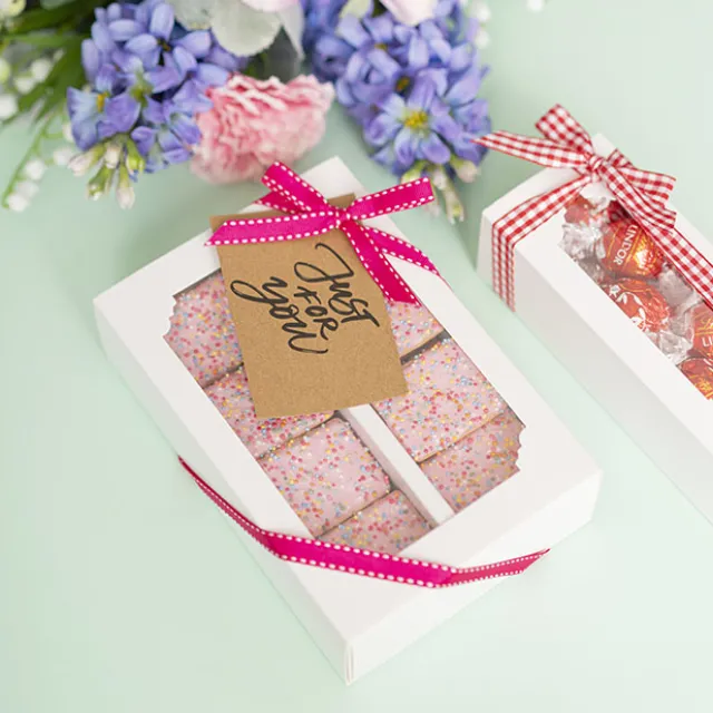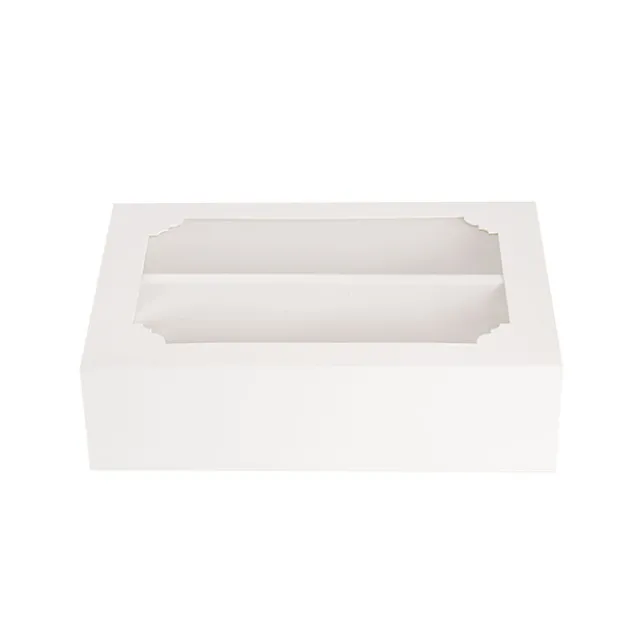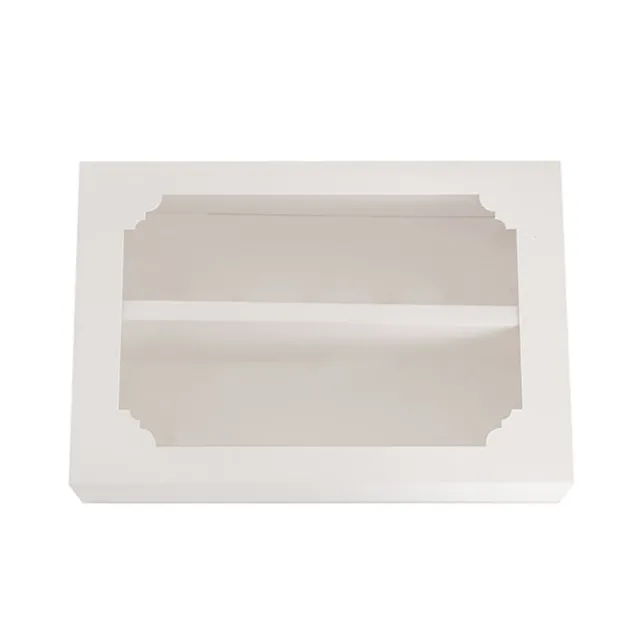 This box easily slides open and comes flat-packed for convenience and storage. This product is food grade and the clear window is made from PE.