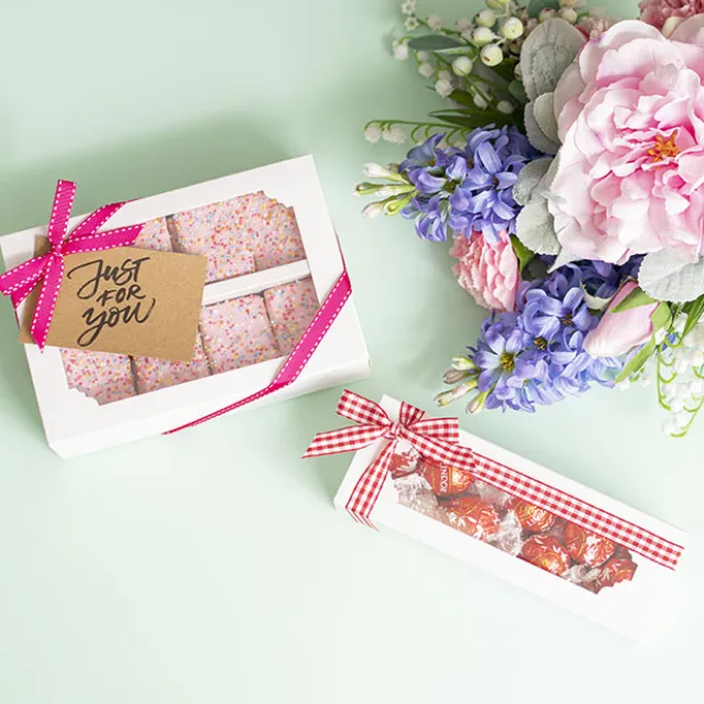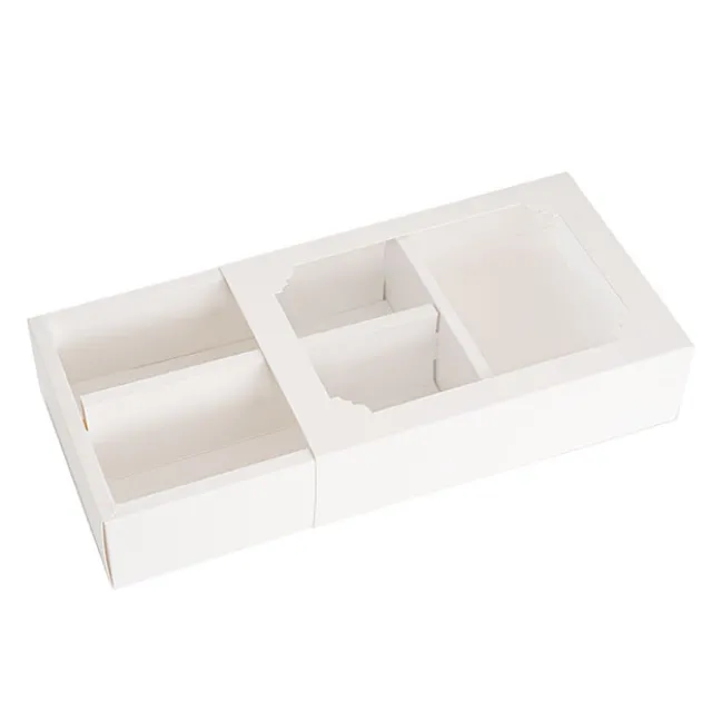 This box easily slides open and comes flat-packed for convenience and storage. This product is food grade and the clear window is made from PE.