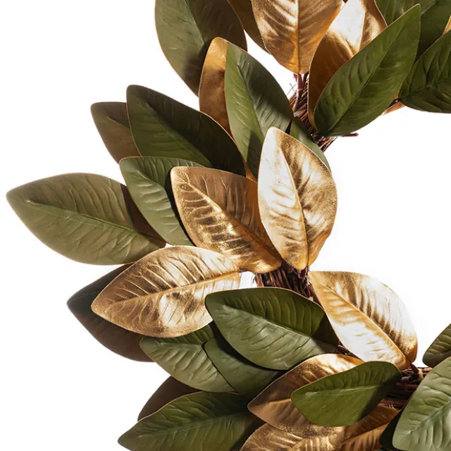 An ideal focal point or wall decor, this wreath brings the enchanting beauty of nature into your space. The intricate arrangement of lifelike magnolia leaves, accented by delicate gold touches, radiates an air of sophistication suitable for various decor styles. You can also try pairing this with our matching Garland (SKU: 33009986GR) for some added festive charm.